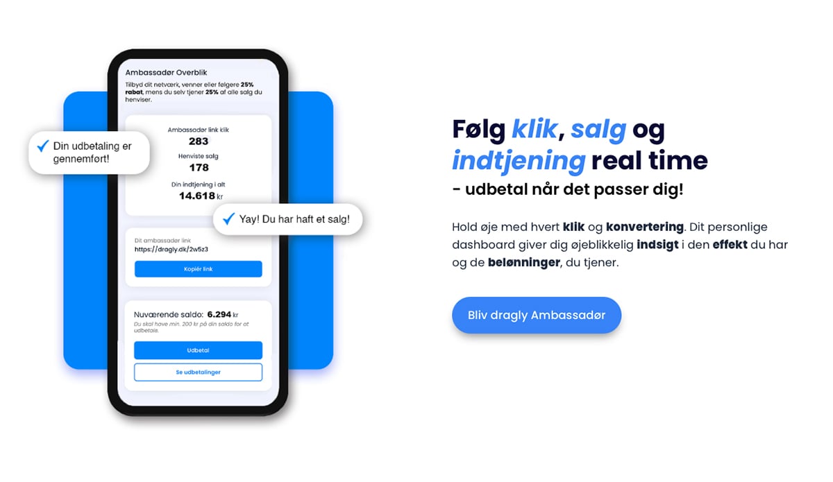 Skal man ud og have udviklet en platform som Dragly her, med ambassadørsystem og hvor alt er 100% automatiseret, så snakker vi hurtigt MINIMUM 500-600.000 kr. Der er brugt ca. 700 udviklingstimer i alt og her har jeg endda brugt meget kode fra tidligere projekter, så det ville tage længere tid, hvis det skulle lave helt fra bunden.
