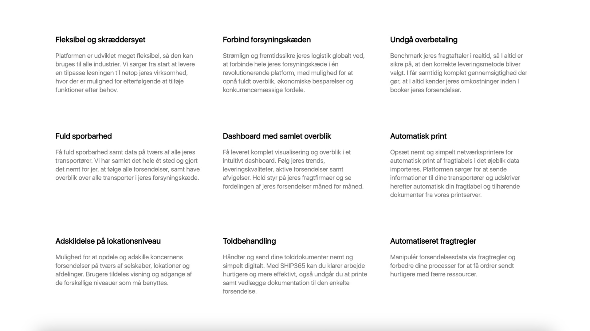 Med SHIP365 kan virksomheder ikke kun reducere omkostninger, strømline logistik processer og øge effektiviteten, men også forbedre kundetilfredsheden gennem pålidelige og innovative logistikløsninger. Vores mål er at gøre komplekse logistikoperationer enkle og håndterbare, hvilket gør SHIP365 til en værdifuld partner i virksomheders vækst og udvikling.