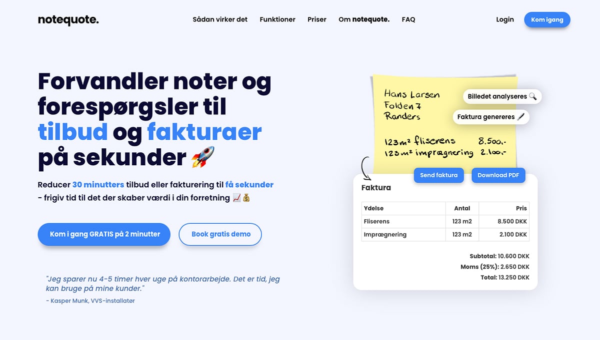 notequote.dk - AI drevet SaaS platfrom som forvandler noter og forespørgsler til tilbud og fakturaer på sekunder! 100% automatiseret - 700 udviklingstimer!