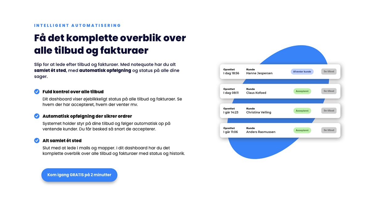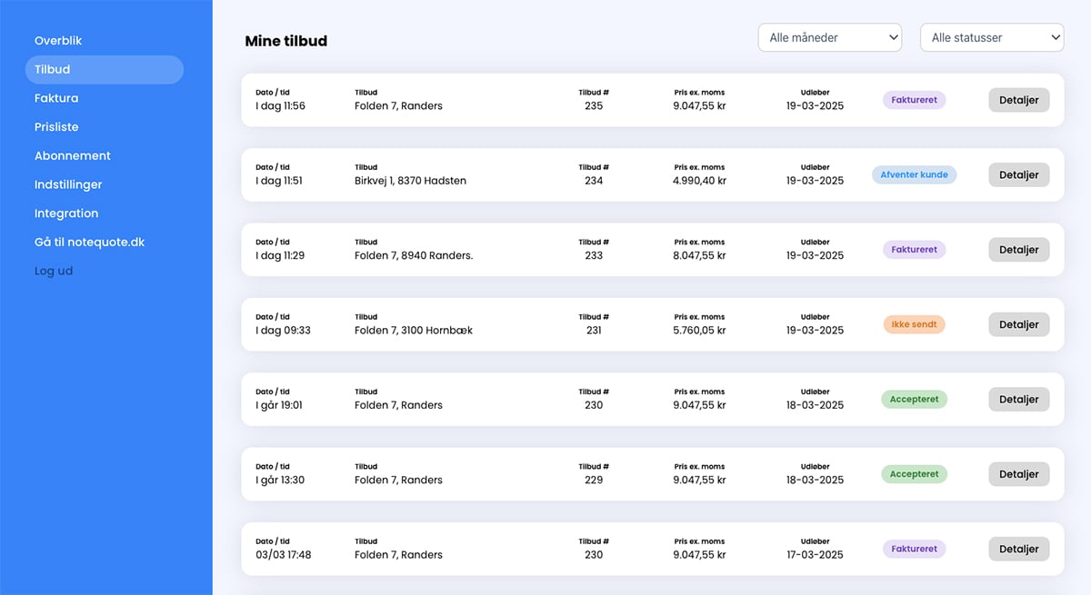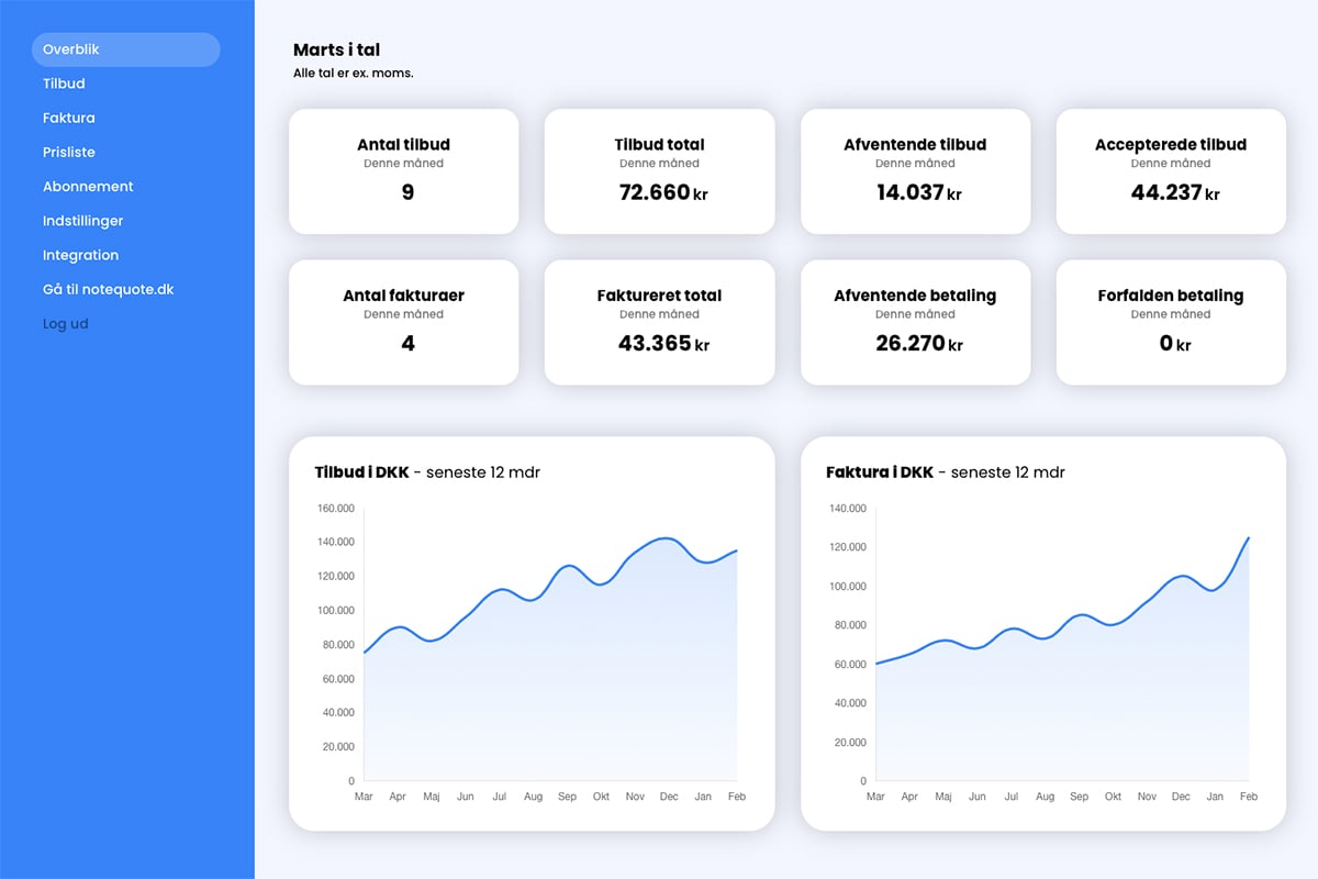 - Dashboard med fuldt overblik over alle tilbud og fakturaer