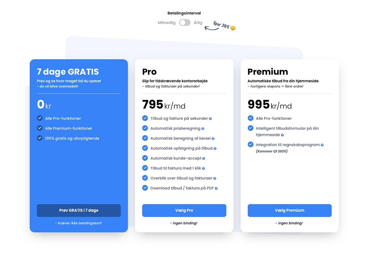 Der tilbydes en 7 dages GRATIS prøveperiode, som gnidningsfrit får brugerne onboardet på platformen, så de hurtigt kan opleve og se værdien vi skaber og oprette de første tilbud og fakturaer. Herefter vil det være nemt for dem, at fortsætte over i et betalt plan.
