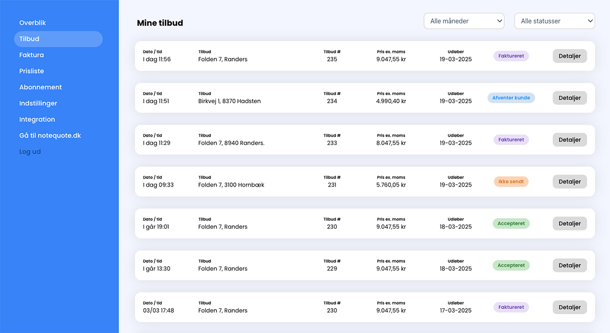 Systemet tilbyder et komplet overblik over alle tilbud med statusstyring, automatisk kundeopfølgning, prisberegning, kørselsberegning og meget mere.