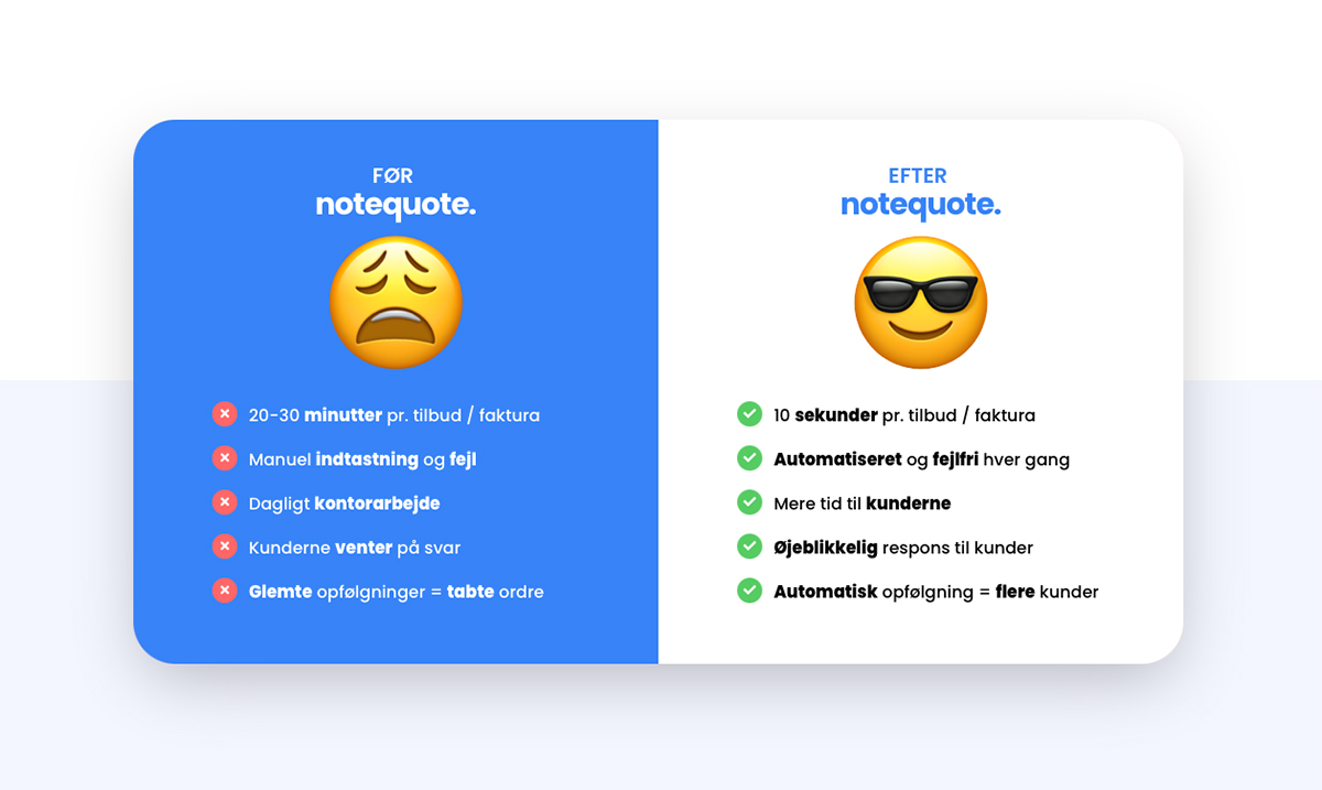 Notequote dækker et kritisk behov hos mindre virksomheder, der bruger uforholdsmæssigt meget tid på administrative opgaver omkring tilbudsgivning, opfølgning og fakturering - tid der kunne bruges på værdiskabende arbejde hos kunder.