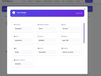 Systemet er 100% automatisk – alt fra CVR-validering, adresseopslag og e-mailnotifikationer til betalingshåndtering og censurering af kundeinfo sker uden manuel indgriben. Partneren kan kun se kontaktoplysninger, når leadet er købt.