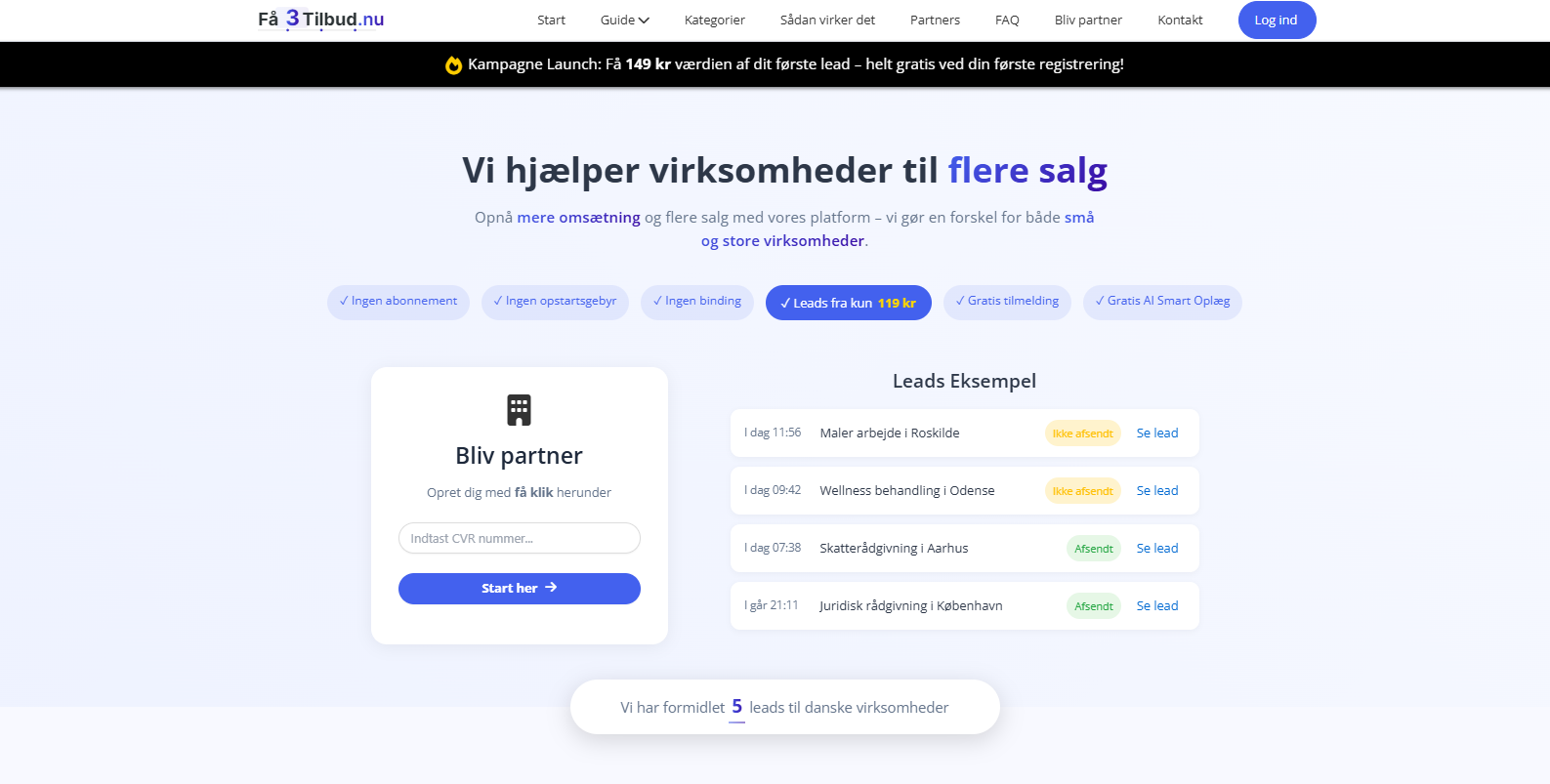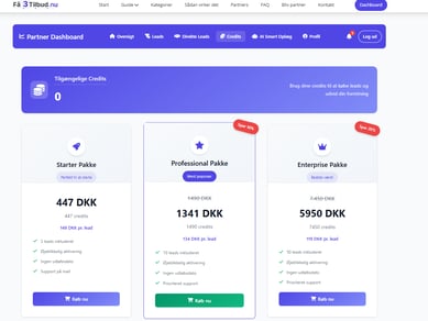 Alle partnere skal vælge én af ovenstående pakker før de får adgang til leads. Dette sikrer, at du som ejer altid modtager betaling før leverance, og opnår 100 % kontrol og likviditet i forretningen.