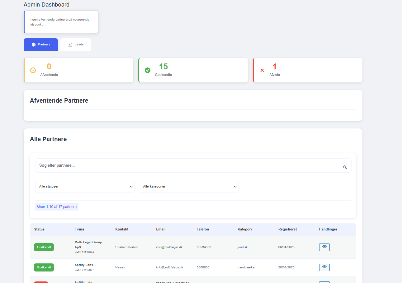 Platformen kræver kun manuel godkendelse af nye partnere, hvilket kan gøres på få sekunder via adminpanelet. Der er allerede 13 registrerede partnere, og de første 3 kunder blev fundet organisk via Google, hvilket tydeligt beviser SEO-potentialet.