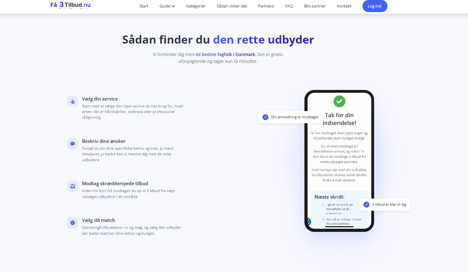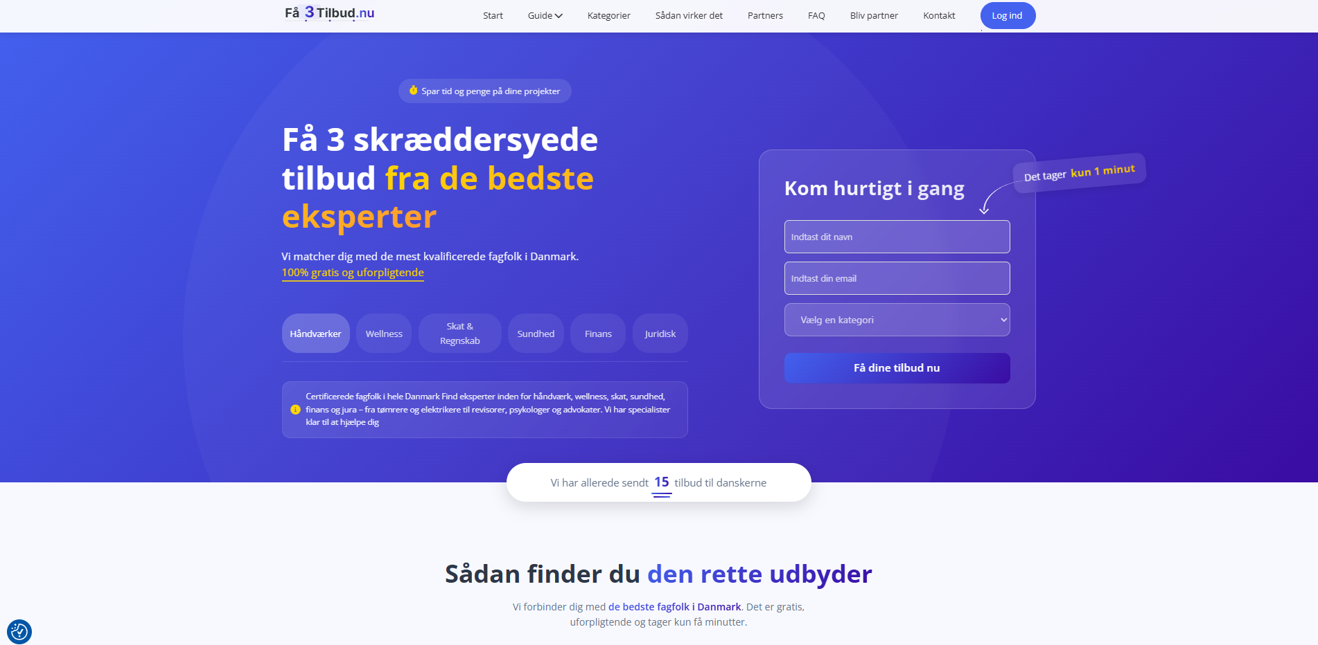 Få3Tilbud.nu er en komplet, AI-drevet og SEO-optimeret leadgenereringsplatform, der automatisk matcher kunder med relevante leverandører inden for bl.a. håndværk, regnskab, sundhed, jura og finans. Kunden udfylder en formular, og leadet sendes enten til op til tre partnere (149 kr. pr. lead) eller som direkte lead (298 kr.) til én partner. Hver branche har egne underkategorier og er skalerbar.