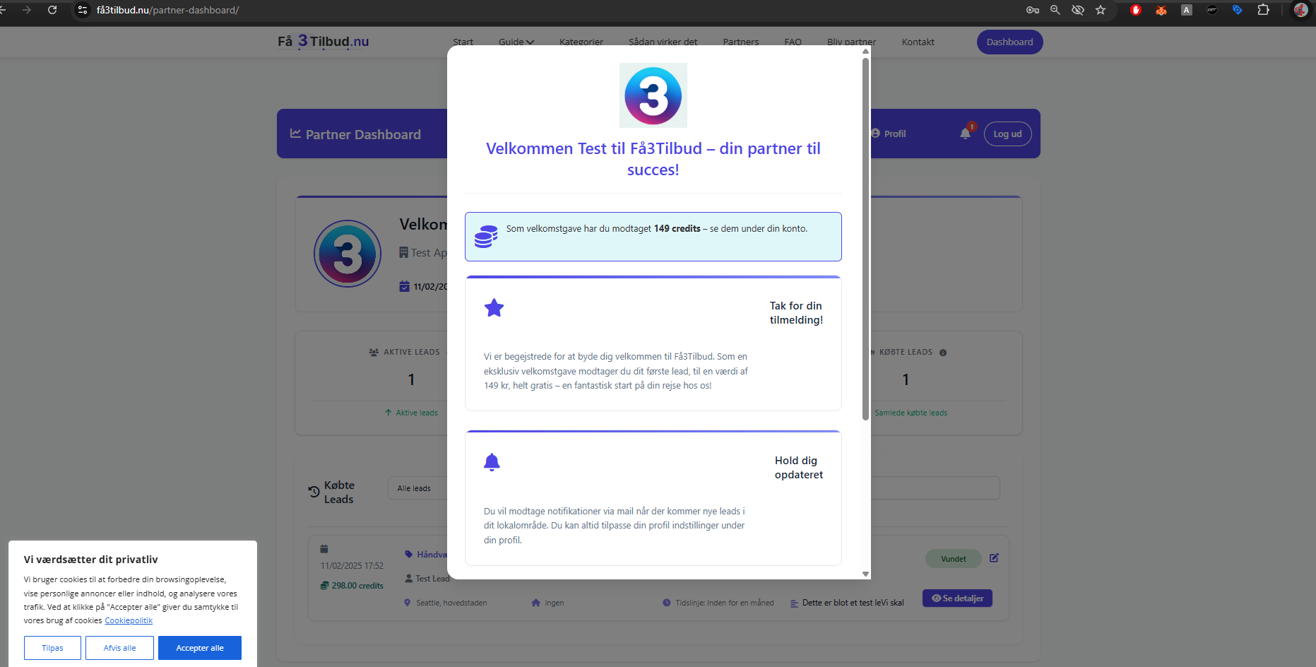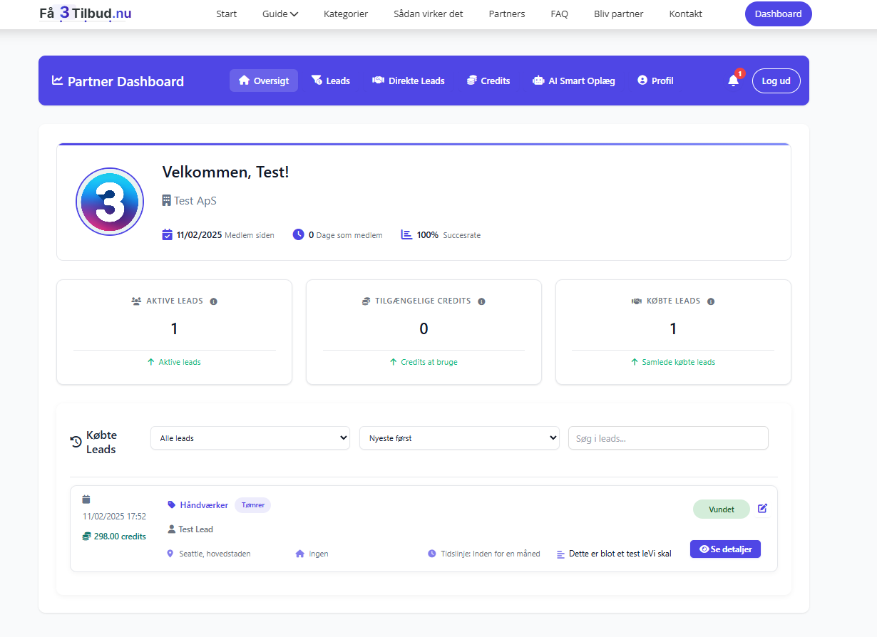 Alle partnere kan gratis oprette sig via platformen, og som en del af den indledende vækststrategi får de første leads gratis som kampagne – hvilket tiltrækker relevante aktører og beviser platformens attraktivitet. Kreditbetaling og leadsalg er allerede fuldt integreret og klar til aktivering. Du vælger selv, om du vil fortsætte med gratis leads i opstartsfasen – eller begynde at tjene fra dag ét.