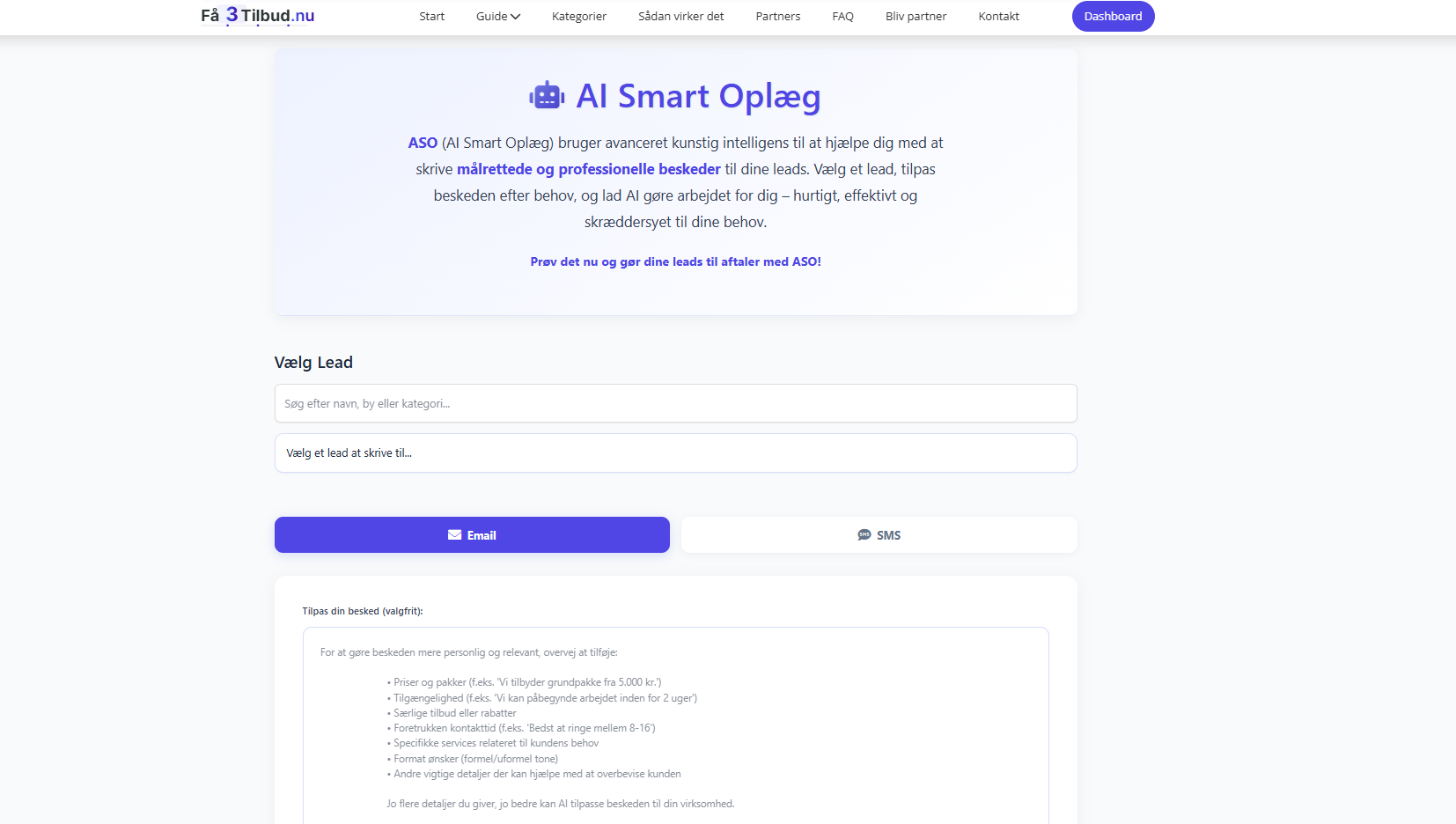 Få3Tilbud.nu er mere end bare en leadmaskine. Med den unikke funktion AI Smart Oplæg (ASO) hjælper platformen partnere med at skrive professionelle tilbud på få sekunder – baseret på kundens forespørgsel og data. Det gør den til et aktivt værktøj og ikke blot en kontaktformidler.