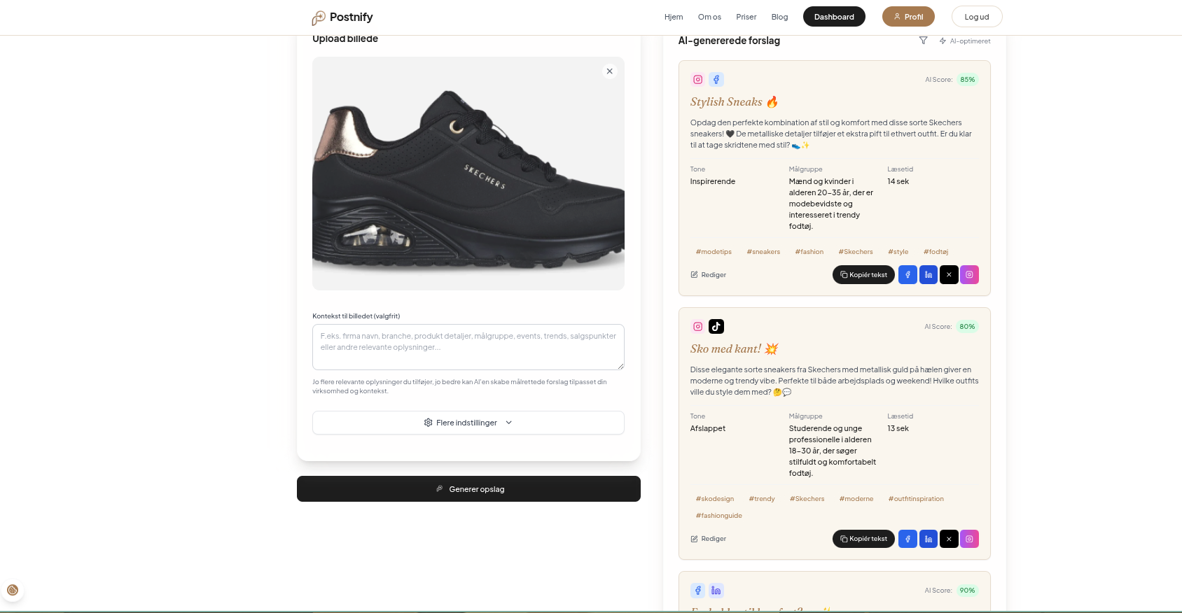 Alle opslag analyseres automatisk, og brugeren får tre unikke tekster til hvert billede. Det hele sker på få sekunder og uden manuel indgriben.