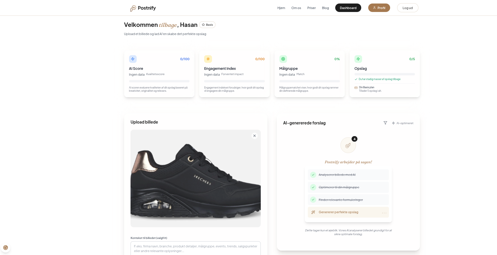 Postnify er en AI-baseret platform til SoMe-indhold, hvor brugeren uploader et billede og får genereret tre professionelle opslag på under 10 sekunder. Løsningen er bygget med moderne stack (Next.js, softifybase, Stripe, OpenAI) og klar til brug uden udvikler, supportteam eller manuel drift. Platformen understøtter fire abonnementsplaner (0–595 kr./md.), og alt fra betaling til faktura og statistik kører automatisk. Hosting og e-mail er betalt til november 2026, og softify.cloud/softifybase kan bruges gratis i starten. Driftsomkostningerne er derfor ekstremt lave, hvilket giver høj bruttoavance og fleksibilitet. Køber overtager hele systemet, inkl. kildekode, prompts, design, AI-integration og rettigheder. Desuden tilbydes 30 dages gratis teknisk support ved overtagelse og mulighed for videre samarbejde efterfølgende. Postnify dækker behovet for effektiv og skalerbar indholdsproduktion for virksomheder og bureauer – og er klar til skalering.