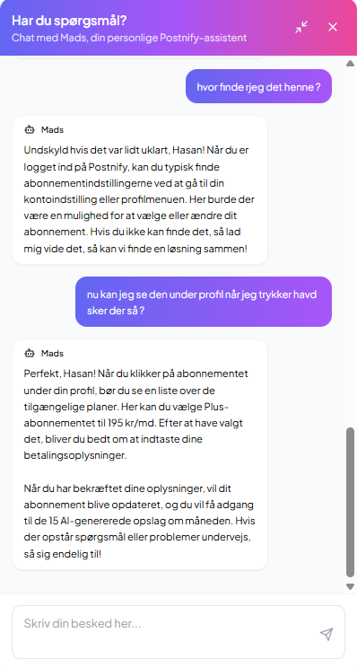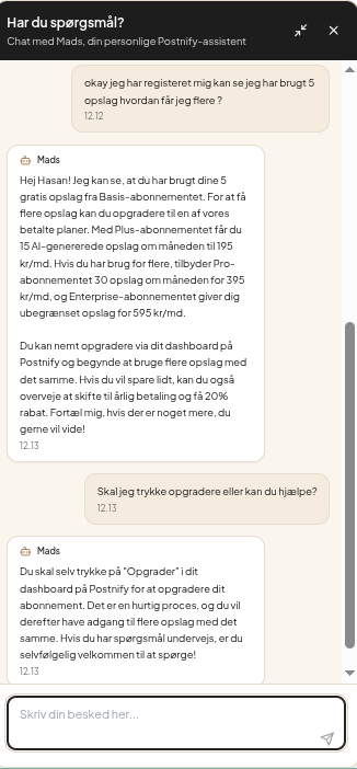 Som udvikler og konceptmager bag Postnify tilbyder jeg 30 dages gratis opstartshjælp, hvor jeg sørger for, at du kommer helt i gang – inkl. overlevering af kildekode, adminadgang og teknisk opsætning. Du får personlig onboarding via mail eller Zoom. Har du brug for hjælp efter de 30 dage, kan videre support og ændringer tilkøbes til fast timepris – så du aldrig står alene, men heller aldrig er bundet.
