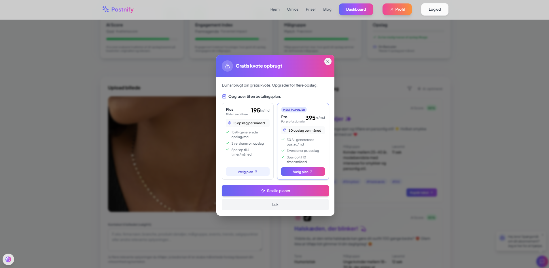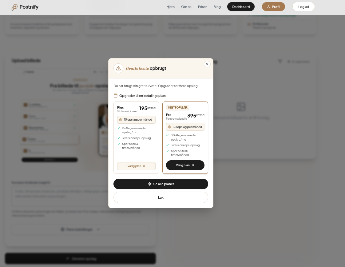 Basis 0 kr. 5 opslag/måned, 3 AI-versioner pr. opslag