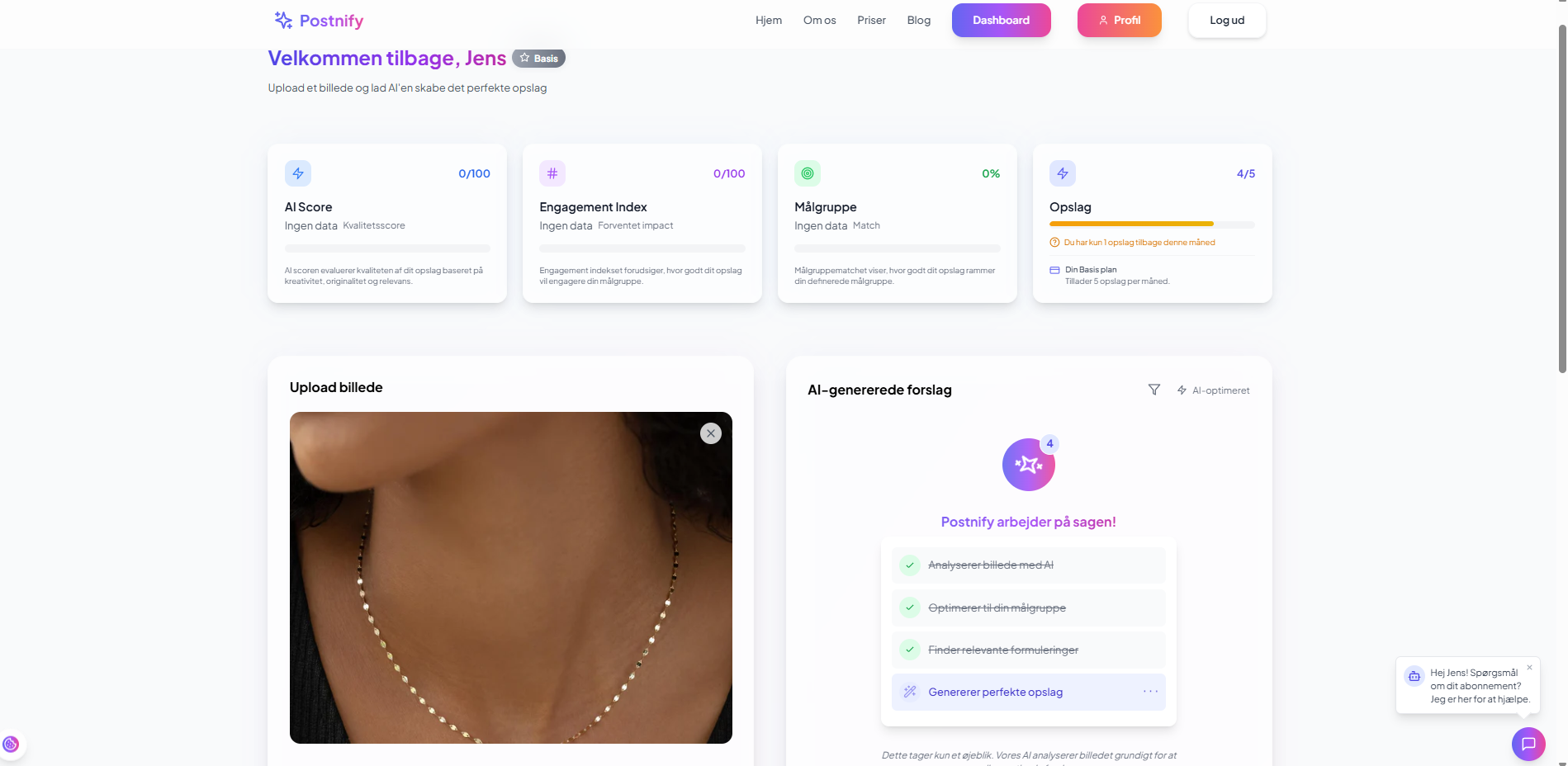 Postnify er en AI-baseret platform til SoMe-indhold, hvor brugeren uploader et billede og får genereret tre professionelle opslag på under 10 sekunder. Løsningen er bygget med moderne stack (Next.js, Supabase, Stripe, OpenAI) og klar til brug uden udvikler, supportteam eller manuel drift. Platformen understøtter fire abonnementsplaner (0–595 kr./md.), og alt fra betaling til faktura og statistik kører automatisk. Hosting og e-mail er betalt til november 2025, og Vercel/Supabase kan bruges gratis i starten. Driftsomkostningerne er derfor ekstremt lave, hvilket giver høj bruttoavance og fleksibilitet. Køber overtager hele systemet, inkl. kildekode, prompts, design, AI-integration og rettigheder. Desuden tilbydes 30 dages gratis teknisk support ved overtagelse og mulighed for videre samarbejde efterfølgende. Postnify dækker behovet for effektiv og skalerbar indholdsproduktion for virksomheder og bureauer – og er klar til skalering.
