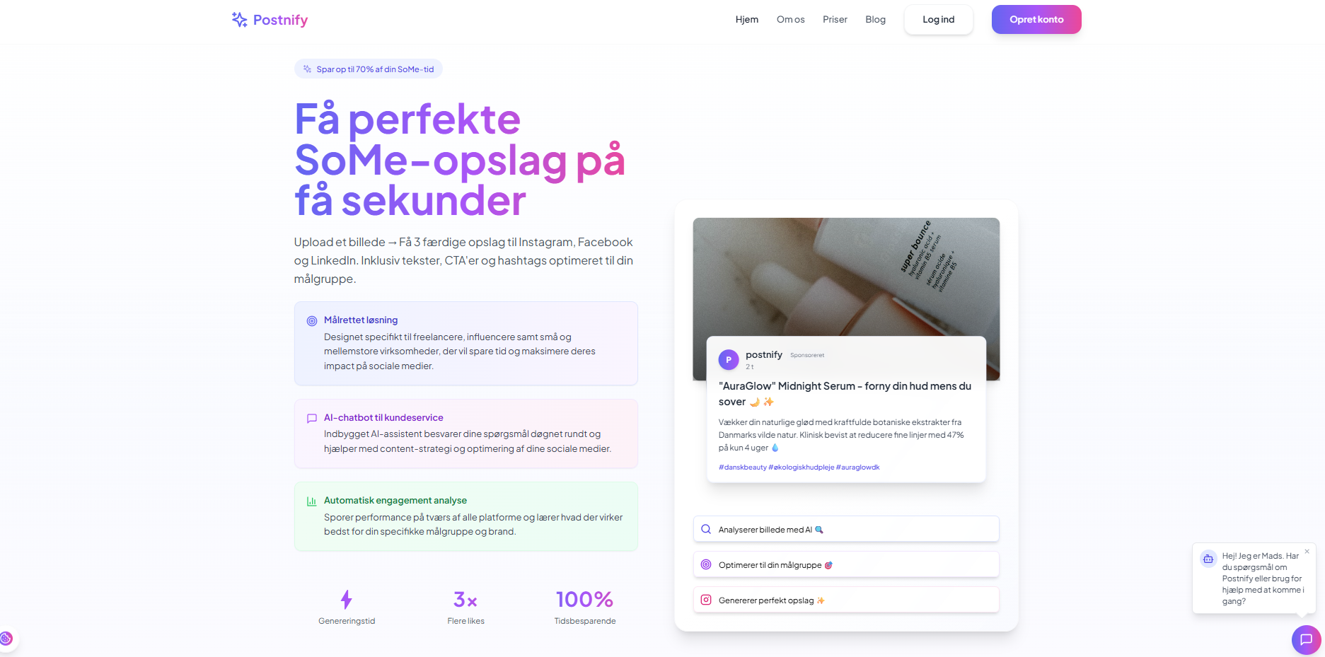 • Indbygget AI-chatbot "Mads" til 24/7 kundesupport og salgskonvertering