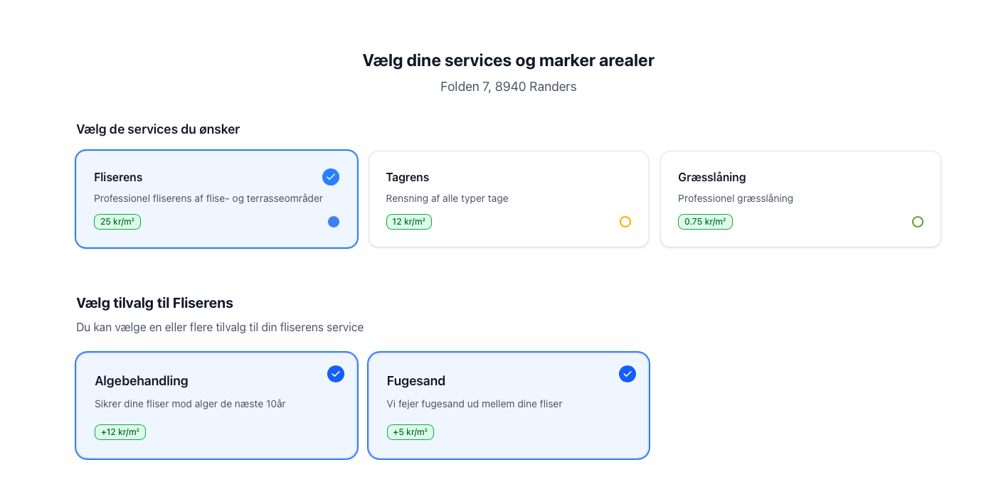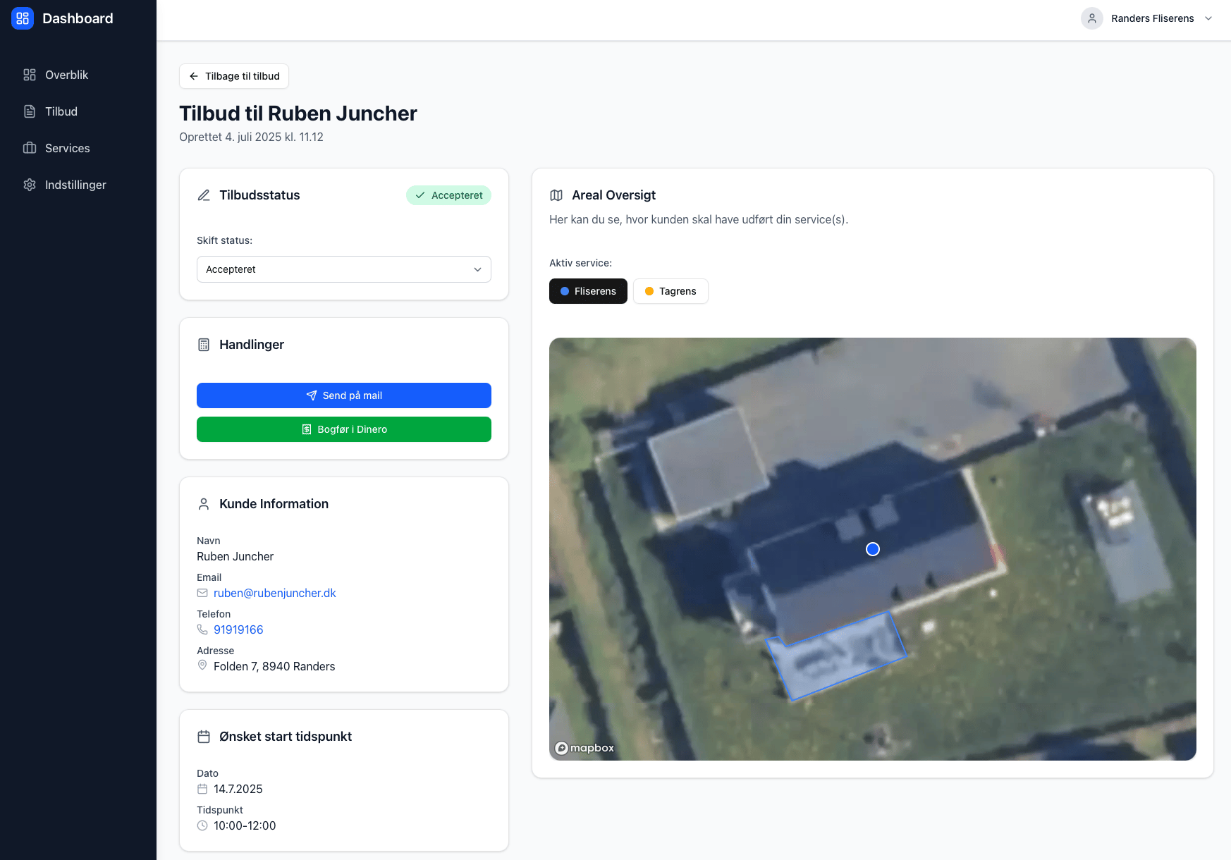 Med avanceret mapping teknologi, beregning af arealer mv, gør vi det muligt for kunden, selv at - nemt og enkelt - markere de områder de ønsker serviceret og så udregner systemet automatisk et komplet og præcist tilbud til kunden, som er klar til at blive accepter MENS kunden sidder og har taget beslutningen om at arbejdet skal gøres!