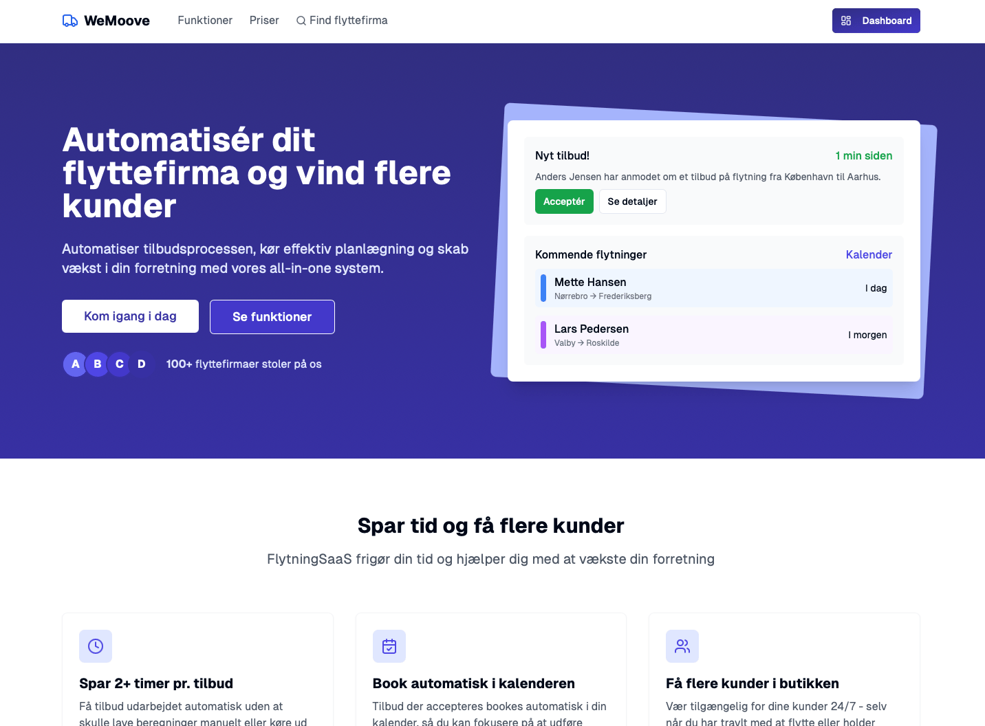 WeMoove er en komplet SaaS-løsning til flyttefirmaer, som automatisk genererer flyttetilbud og håndterer booking, medarbejdere og flyttebiler – helt uden manuel indsats. I stedet for at bruge timer på at udregne tilbud og koordinere biler og medarbejdere, får flyttefirmaet alt serveret på få sekunder. Løsningen sparer tid, vinder flere opgaver og kræver ingen teknisk viden at bruge.