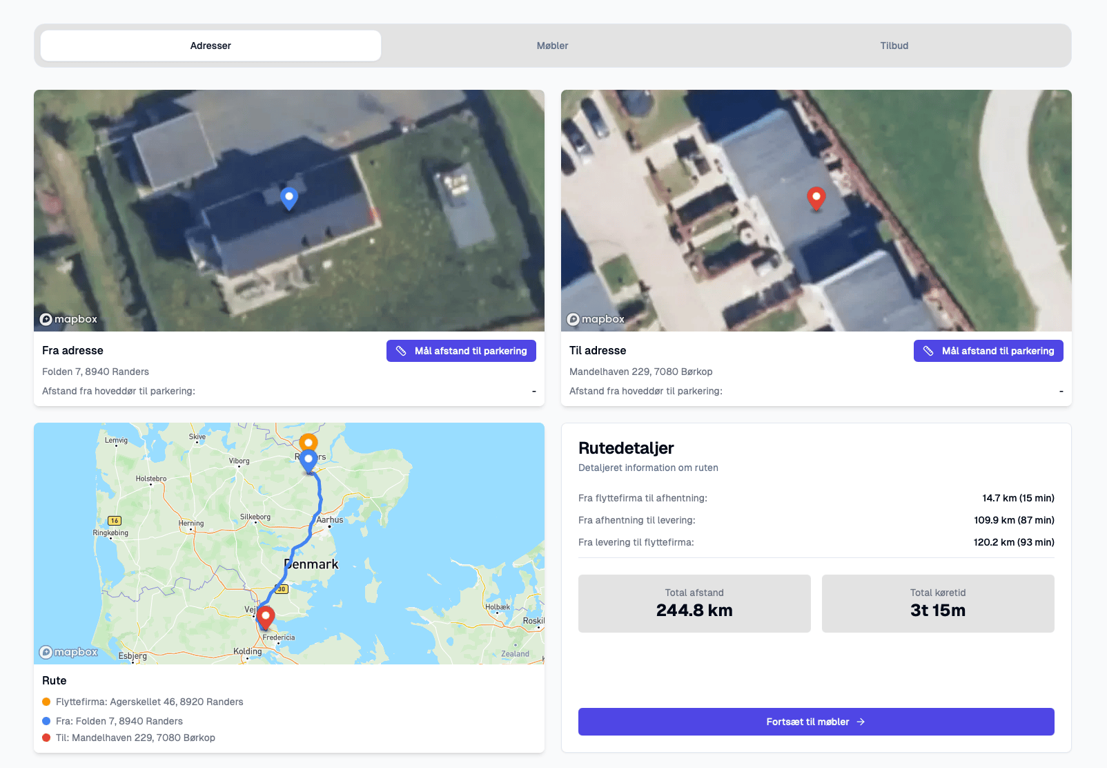 Systemet finder automatisk ejendommene, som der flyttes til og fra, komplet ruteberegning tur / retur, udregning af hvor mange m3 møbler kunden har, estimering at tidsforbrug for flytningen osv.