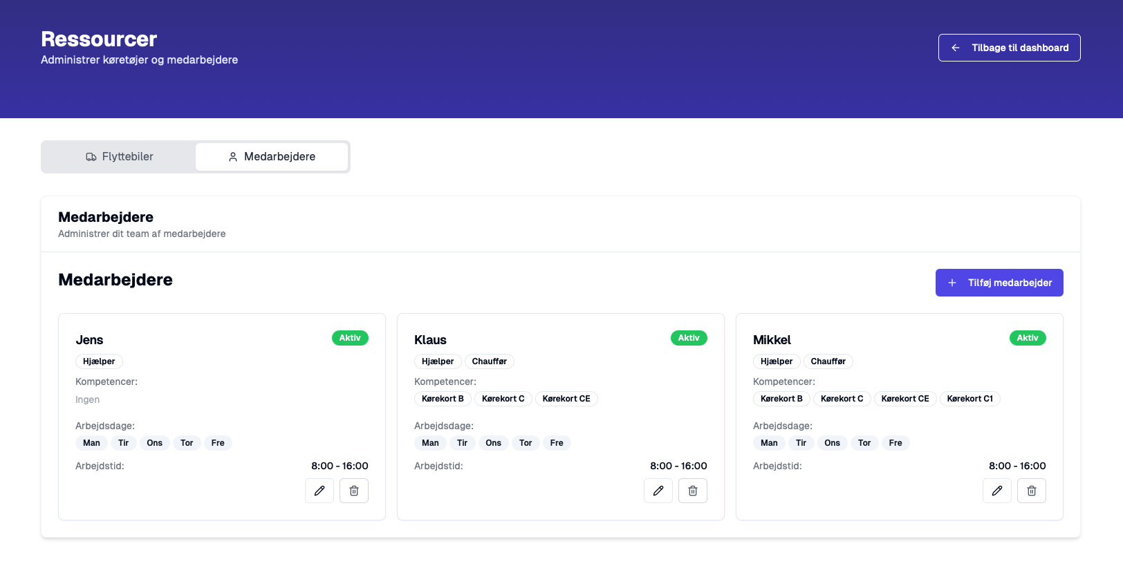 Flyttebiler og medarbejdere oprettes nemt i systemet, så de automatisk vurderes ifht de enkelte flytteopgaver.
