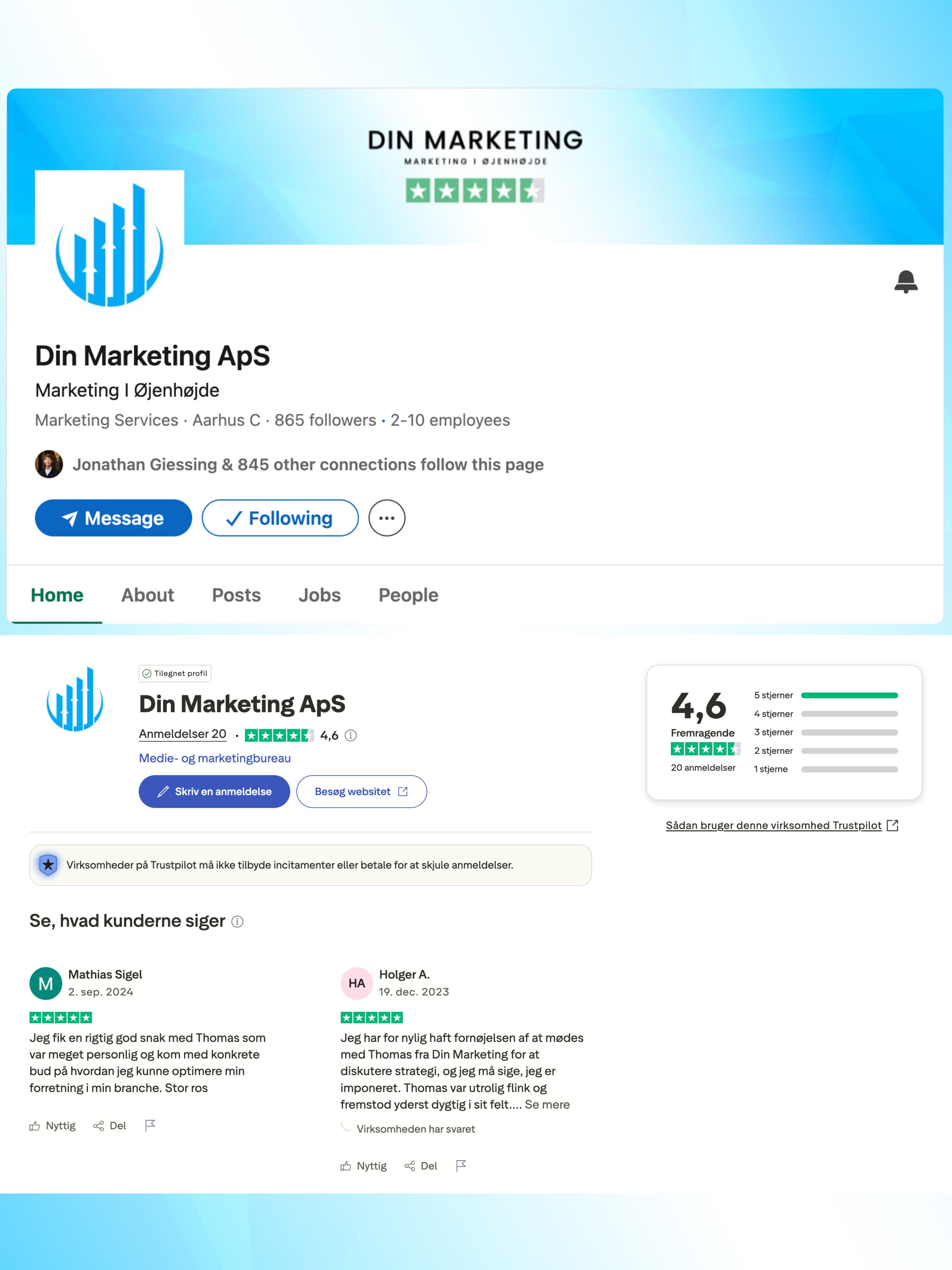 Din Marketing har et stærkt og troværdigt navn med en professionel hjemmeside, gennemarbejdede budskaber og dokumenteret social proof via kundeudtalelser.