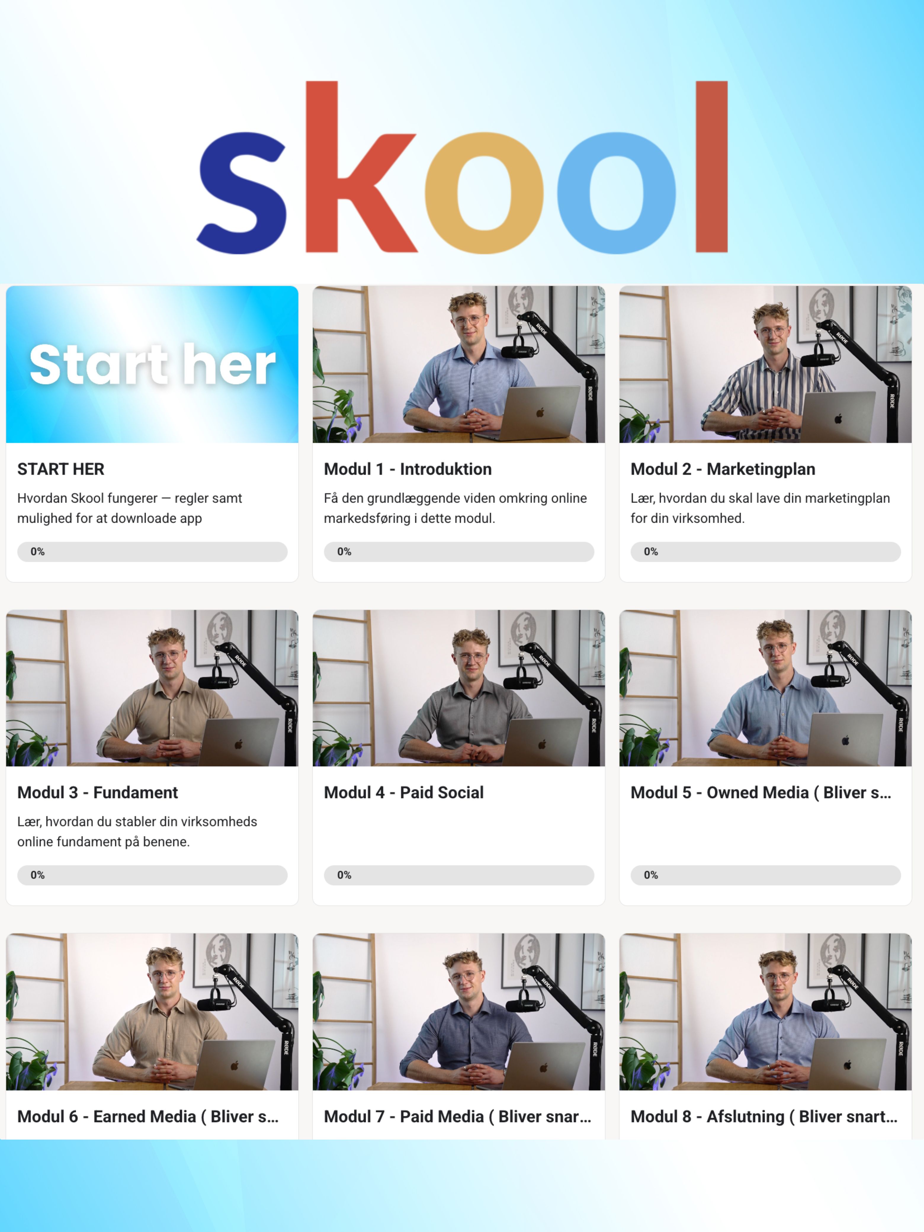 Fremtiden for Din Marketing kan blandt andet gå på at bygge videre på det community omkring online markedsføring, jeg har startet på Skool.com. Alle 52 videoer (én ny video til hver uge om året) ligger allerede uploadet, og communityet skal blot genaktiveres. Hvis der er brug for det, vil jeg gerne stille mig til rådighed i forbindelse med kurset, da dette er bygget op omkring mig. Indtil du som køber for kørt det mere over på dig kan jeg hjælpe til.
