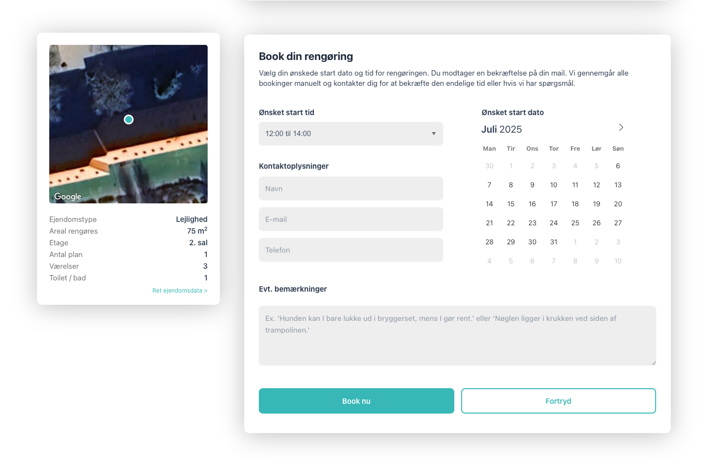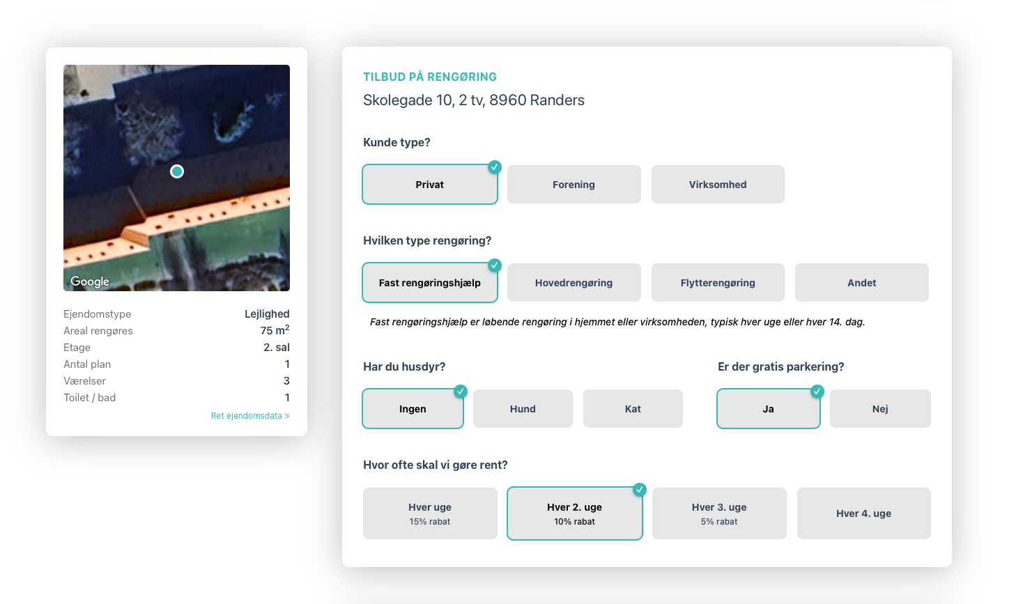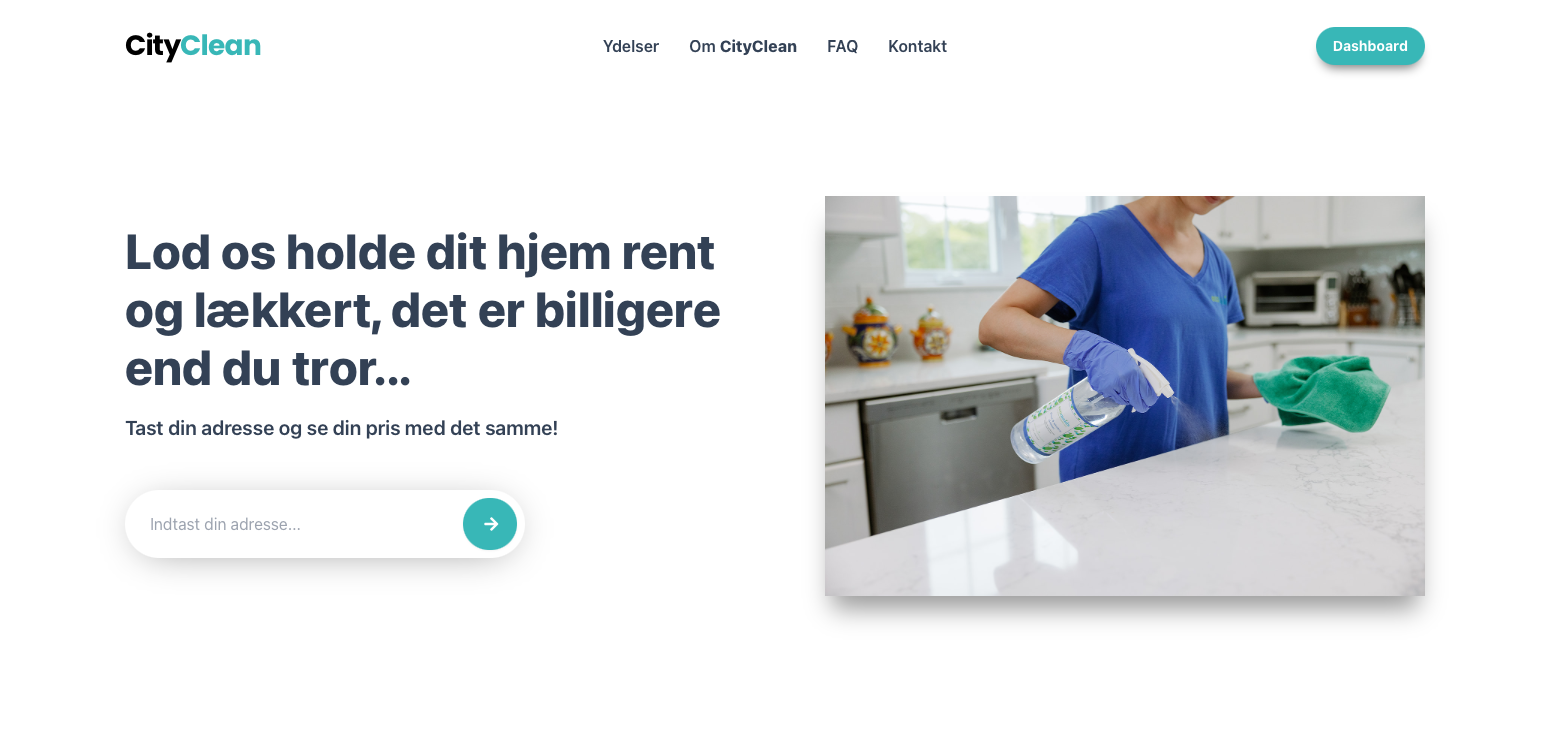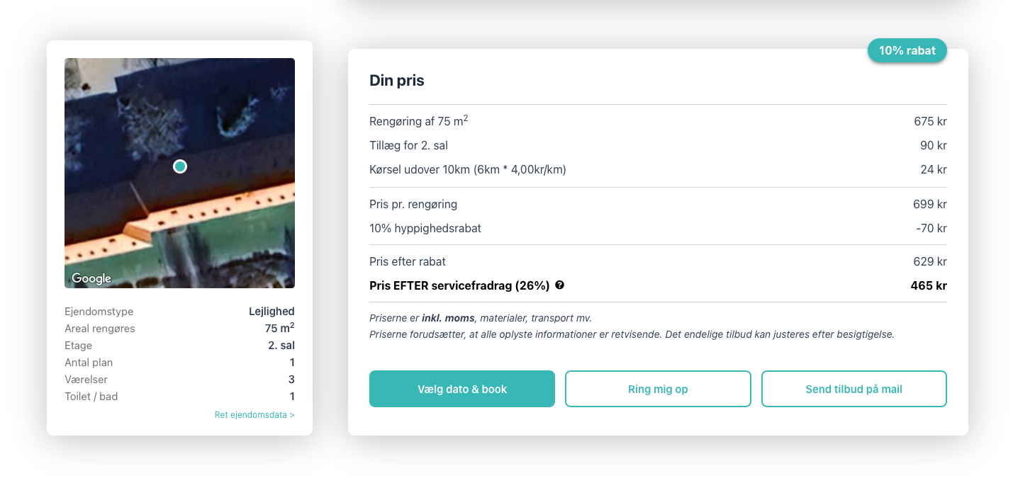 Cliinly bygges direkte ind på rengøringsfirmaets eksisterende hjemmeside og forvandler den til en tilbudsmaskine. Kunden taster sin adresse, vælger type rengøring og får et komplet tilbud på under 10 sekunder - og kan booke med det samme.