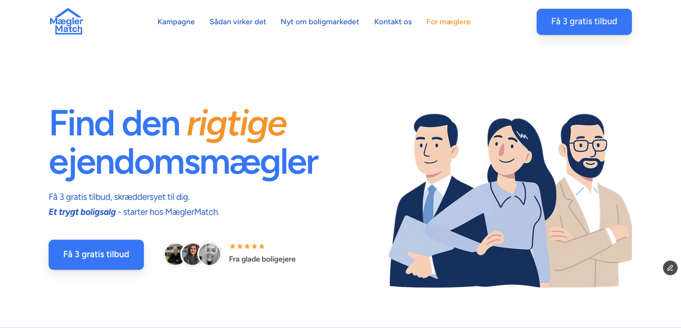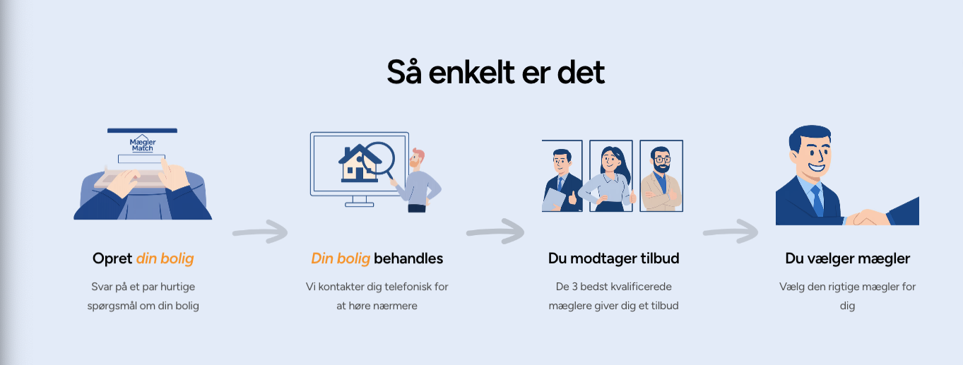 MæglerMatch er en digital platform, der hjælper boligsælgere med at finde de tre ejendomsmæglere, der passer bedst til deres bolig og salgssituation. Brugeren udfylder en kort formular, og herefter udvælges de mest relevante mæglere personligt — en model som har vist sig langt mere effektiv end automatiske “først-til-mølle”-løsninger.