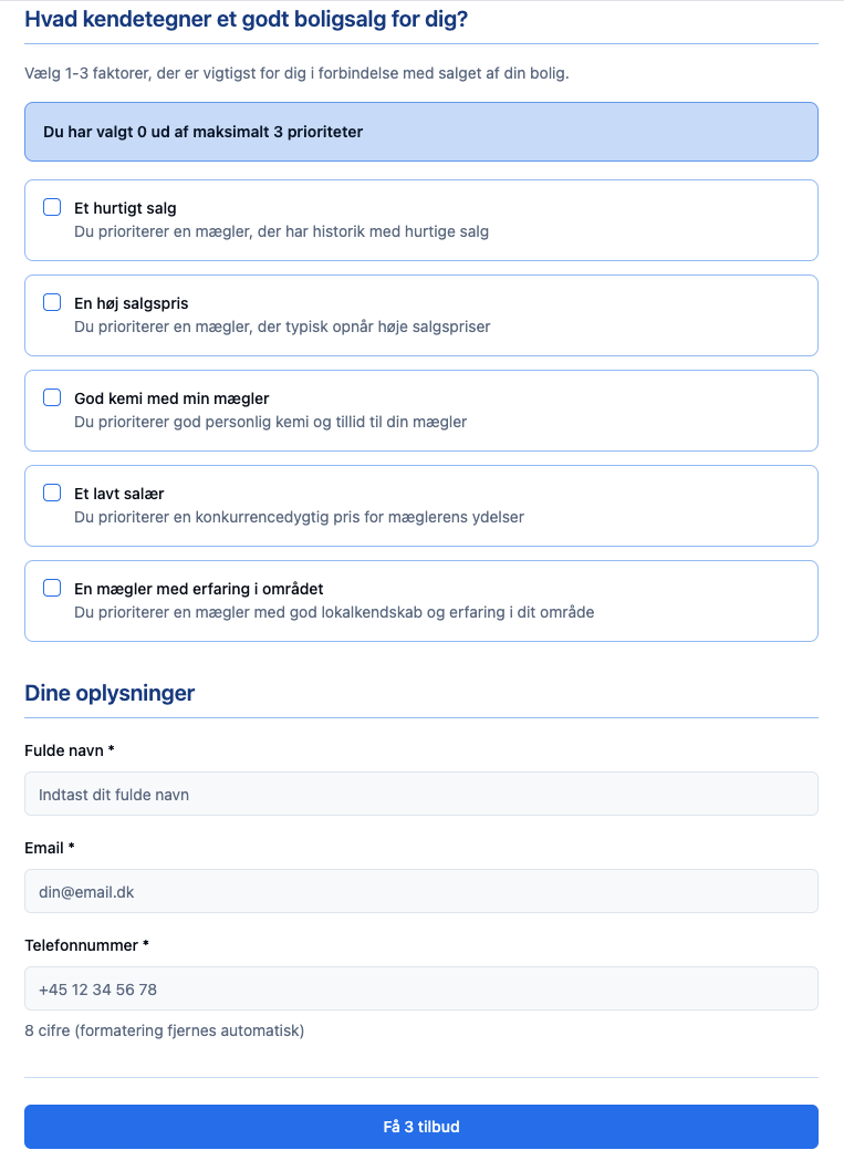MæglerMatch er en fuldt udviklet digital platform, der hjælper boligsælgere med at finde de tre bedste ejendomsmæglere til netop deres bolig. Modellen er baseret på personlig udvælgelse og rådgivning, hvilket har vist sig langt mere effektivt end automatiske matching-systemer — både i konverteringsrate og brugerfeedback.