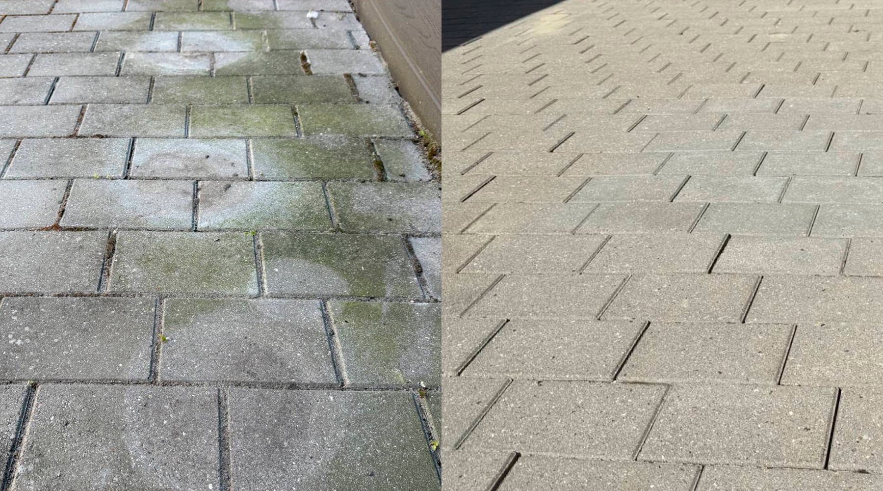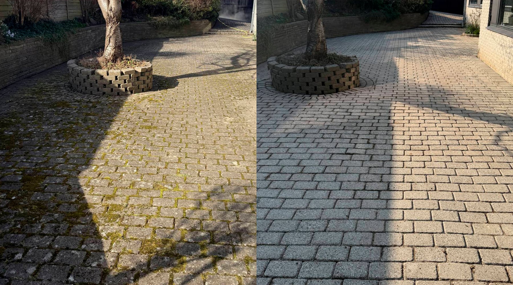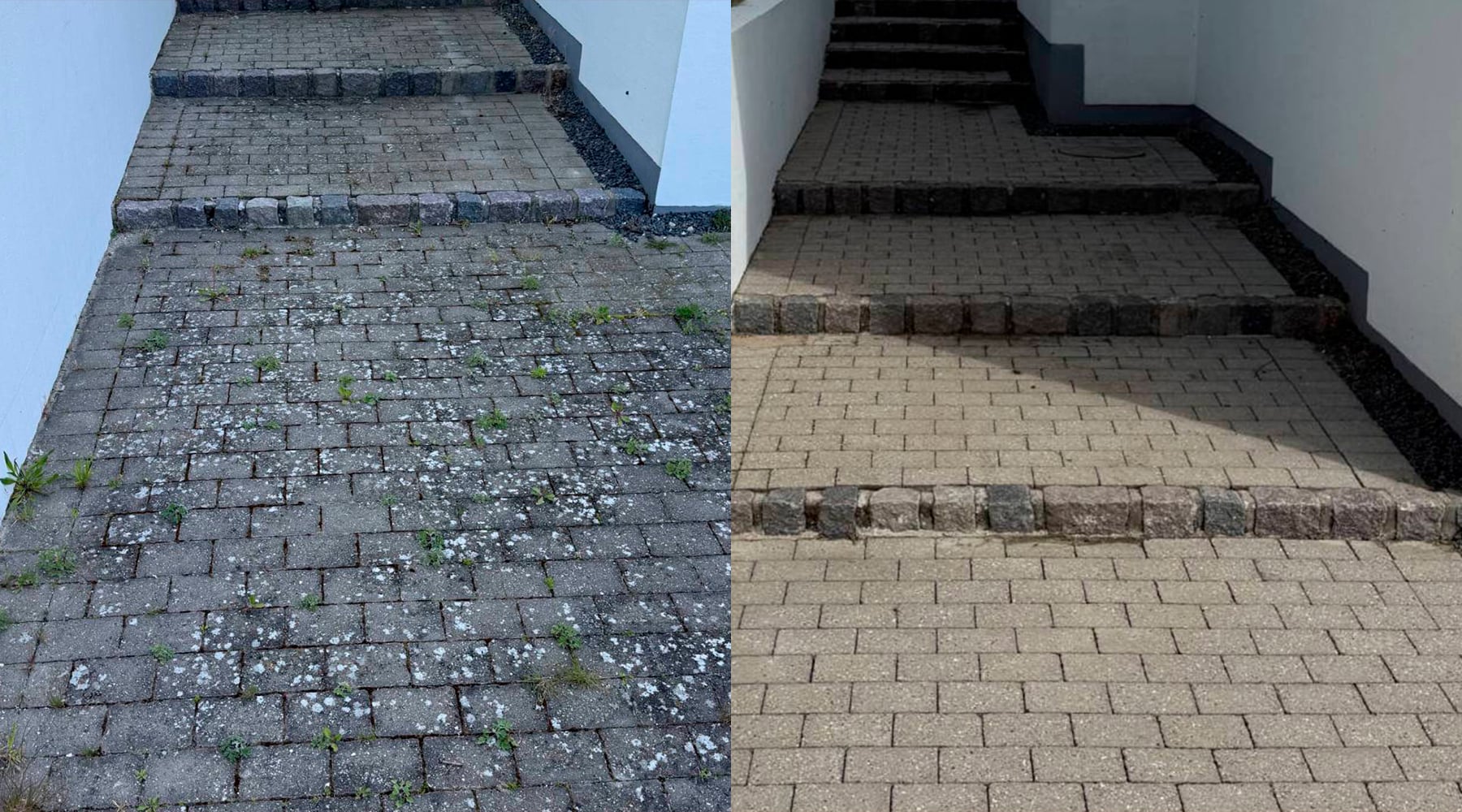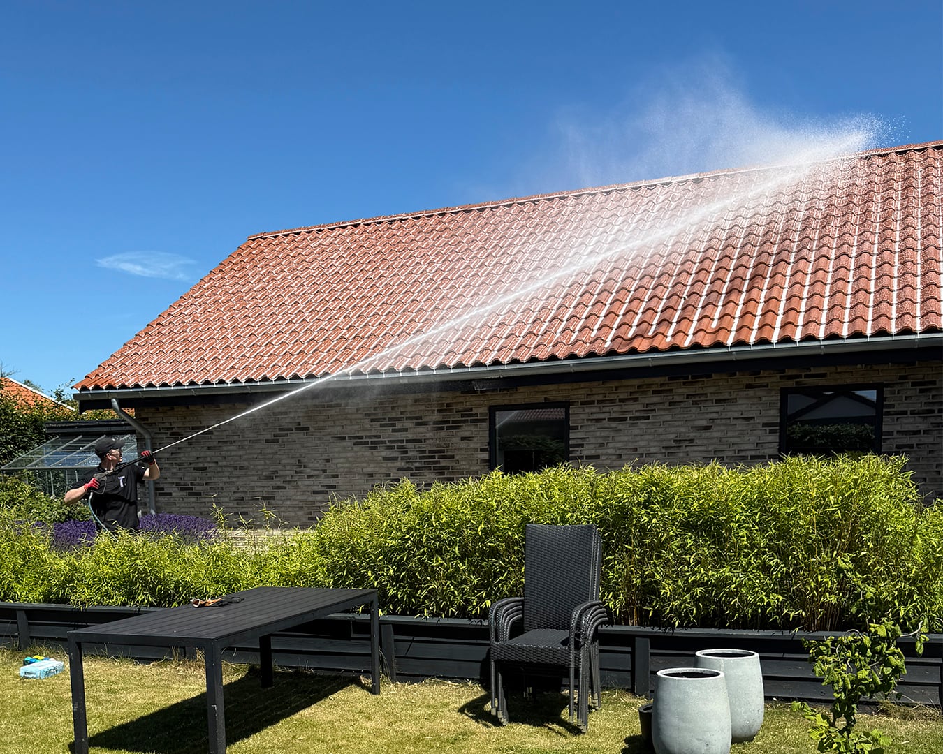 Der tilbydes højtryksrens, algebehandling og imprægnering af fliser og træterrasser, samt algebehandling af tag.