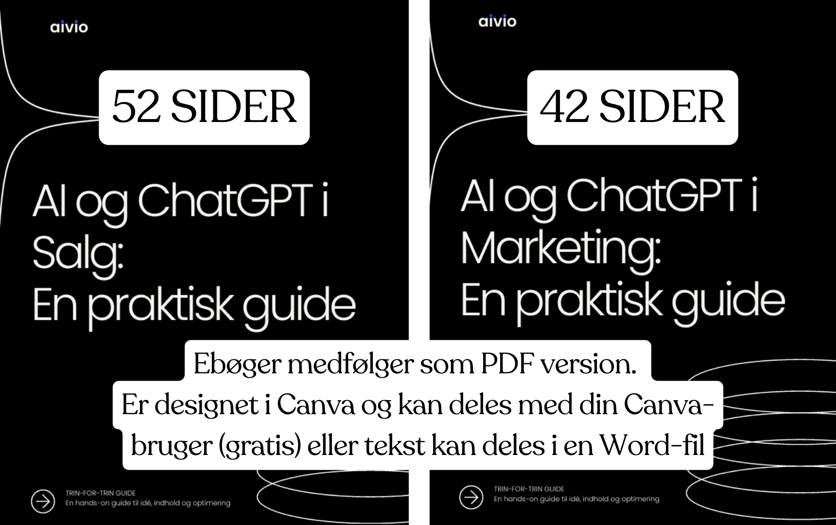 - To færdigskrevne Aivio-eBøger (+40 sider hver) om brugen af AI og ChatGPT, målrettet sælgere og marketingfolk, klar til kommerciel anvendelse og videresalg