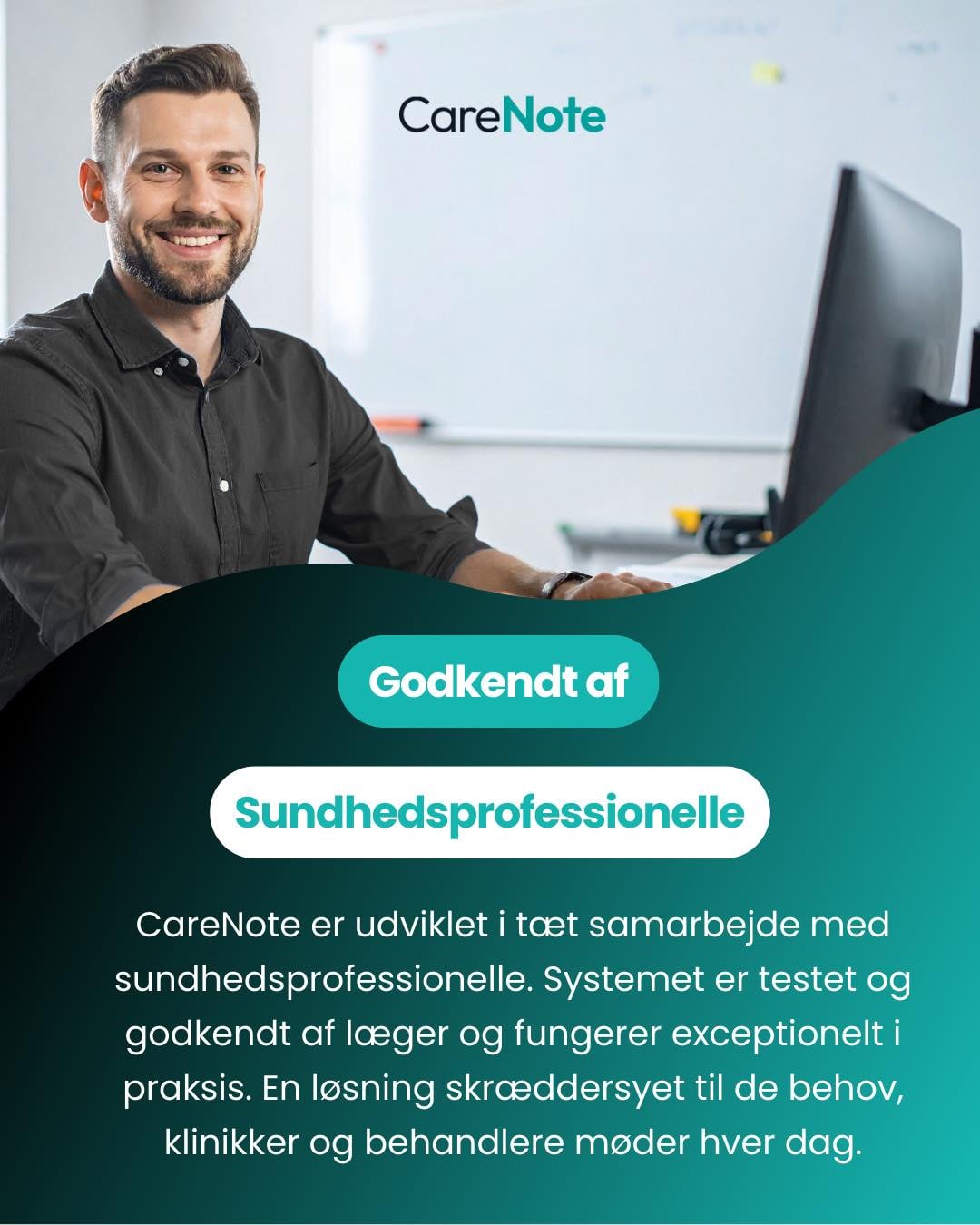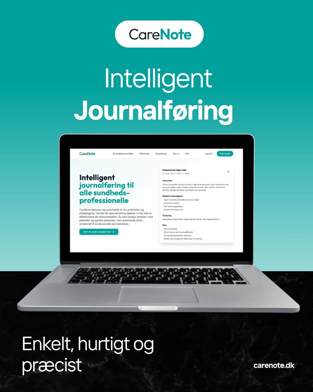 CareNote tilbyder en stærk og moderne health-tech løsning til intelligent journalføring og dokumentation for private klinikker og behandlere. Produktet er udviklet for at løse et udbredt problem i markedet, nemlig at dokumentation ofte er en tung, tidskrævende og ineffektiv del af hverdagen. Med CareNote får klinikker et digitalt værktøj, der gør dokumentationsarbejdet hurtigere, mere præcist og mere ensartet, samtidig med at det frigiver tid til patientkontakt og behandling.