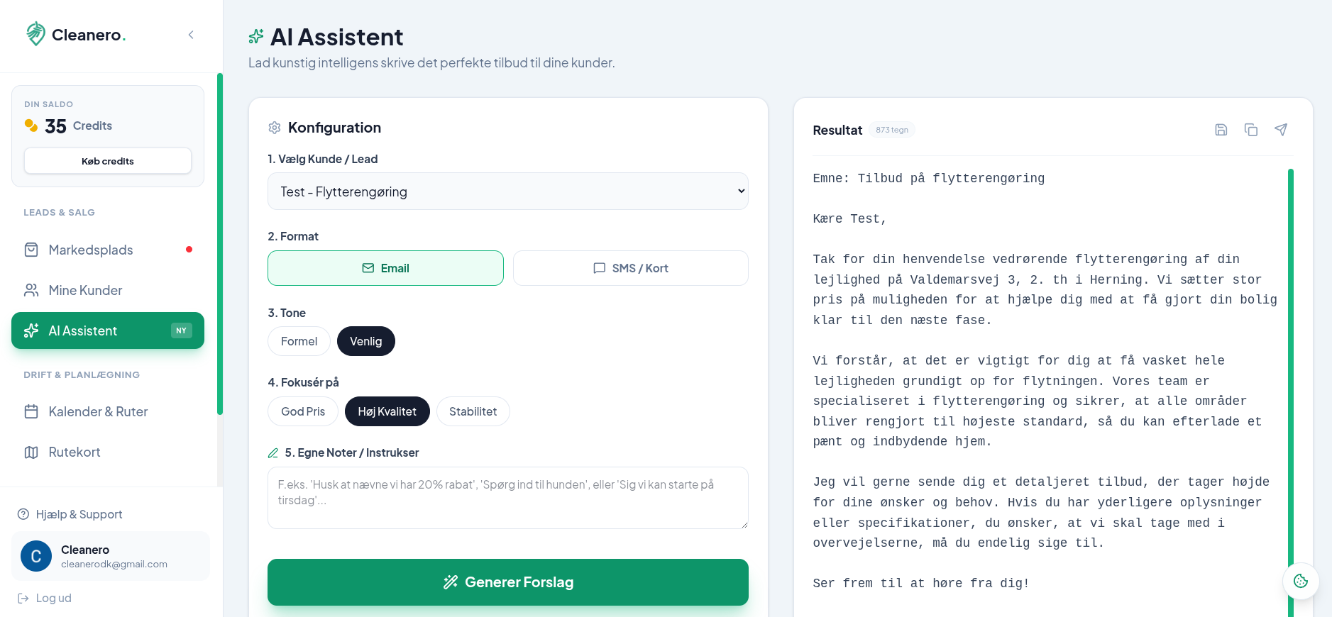 • Pris pr. AI-genereret tilbud: under 15 øre (0,15 DKK)