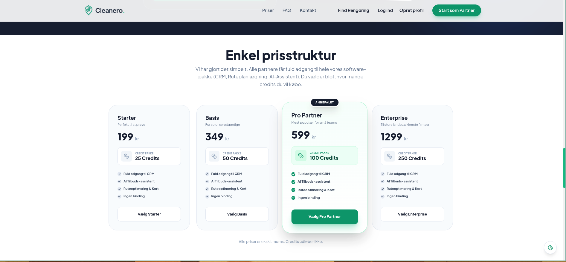 • Rengøringsfirmaer køber credit-pakker (199–1.299 kr) for at låse kundeleads op